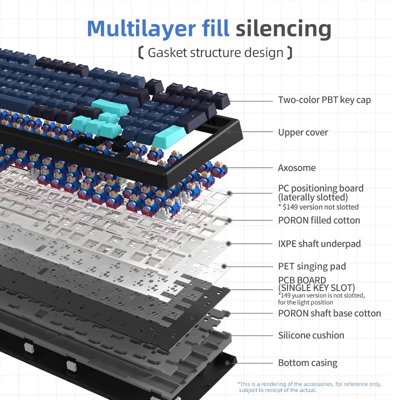- Cấu trúc gasket mount, Xinmeng X98 pro mang đến sự êm ái và ổn định khi sử dụng giúp giảm thiểu rung động và tiếng ồn, tạo ra một trải nghiệm gõ phím trơn tru và êm ái.